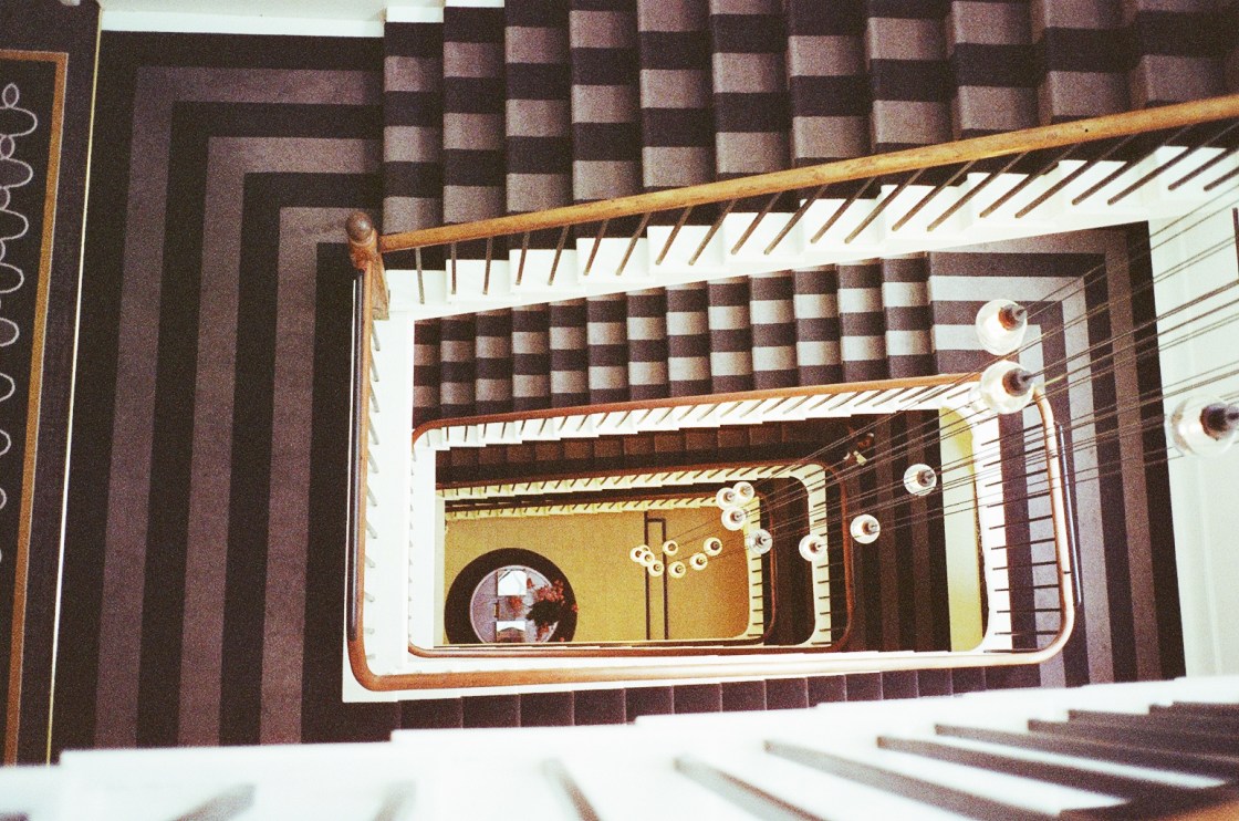 Beyond its distinctive, honey-colored Georgian facades, the property is at once modern and elegant. Think alabaster columns and marble floors that shine in contrast with a stunning stairwell, where artistically hung lightbulbs are a focal point. Black and grey striped carpet create a mesmerizing effect, while clean lines lead the eye to each floor landing.